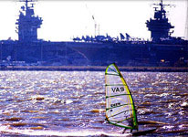 Buckroe Beach is best sailed in any winds from the north-northwest, clockwise to the southwest. Offshore winds produce nice conditions with flat water on the outside, although the wind line will be pretty far out. During summer doldrums, if temperatures are in the upper 80s or low 90s, a sea breeze can kick in around 3 p.m. to turn a NE-SE 10-knot forecast into a great 5.5 afternoon. Northeast and east winds produce big chop due to the large fetch, and the shorebreak, known to eat equipment, can be treacherous. The current can be strong and runs parallel to the shore, so watch for diminishing winds if you sail a sinker. Those not familiar with rough seas should sail Buckroe with due caution. Sideshore winds can easily be sailed by the novice, however the water depth is overhead from about 30 yards out. The bottom is clean so there is not a lot of need for booties, however the jetties are covered with barnacles that can send you to the hospital. Windsurfers are restricted to a narrow launch shared with jetskis at the north end of the beach at Pilot Avenue during the beach season (Memorial Day to Labor Day). On bad beach days (i.e., rain, lots of wind!) and in the offseason, the entire public beach is open to windsurfing. Other than the jetskis, there is little trouble with boating traffic as there is plenty of space and the shipping channel is about three miles to the southeast. North end parking is scarce so you must find it on First Street, although the police usually tolerate offloading and then rigging at the grassy rigging area. There is plenty of parking off season at the south end. Occasionally, weeds are a problem so it's a good idea to bring along a weed fin. Jellyfish can be bad in the summer, although their threat changes on a daily basis. The water temperature ranges from a low of about 35 degrees in February to almost 80 in August. Mill Pond at Fort Monroe is best sailed during west to northeast winds, with west being sloppy. It's a great place for beginners and flatwater sailors because when other sites are too rough, Mill Pond is still pretty flat. The winds are flukey, however, gusting frequently and shifting by as much as 45 degrees in just a few seconds. MP's will close the Mill Pond in "dangerous" conditions (e.g., Hurricanes). Call 727-2238 first before heading out. Note: It feels much windier from the edge of the road than it is out on the water due to the slope of the seawall. Be cautious of the two small bridges that span the only pathways for incoming and outgoing water. On an outgoing tide, stay well away or you might be sucked underneath. There are strong undertows if you go under the single bridge beyond the first two.