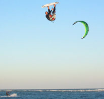 The other side of riding Matanzas Inlet is the surf. The outside break at Matanzas is notorious in the St. Augustine area for being able to handle just about any size, and has a rivermouth point break effect on the surf depending on the swell size and direction. However, be forewarned, the surf at Matanzas is not for beginners. The outside break is a quarter mile out to sea, and if you drop your kite, the outgoing current and breaking waves can make it very difficult to relaunch. If you don't get washed back into shallow water you run the risk of getting sucked out to sea. I've lost more than one board out there, but they always wash back in on the downwind side after a time. On the north side, the channel depth and outgoing current messes up the waves on the outside. As you get more towards the middle of the inlet, the outside break has alot more sand and can get hollow. The best waves are generally found more towards the middle and south side of the inlet on the outside break. On a strong NE swell a left-hand peak in the middle sometimes breaks for several hundred yards. The best thing is that on a N or NE wind you can ride downwind in the surf until you reach the S side of the inlet, then head back into the current for a round trip right back to the start of the conveyor belt.