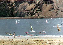 Rowena State Park is a very popular family orientated sailing area offering a number of friendly ammenities. Several good-sized parking areas have been creatively combined to allow an excellent loading and unloading zone leaving a short walk to the water. Since this is a State Park, it requires a $3 daily parking fee which is well worth it when you factor in all of the benefits of an attractively designed windsurfing park. Rowena also receives very strong westerly winds from May until September and usually provides small to medium, fairly closely spaced but quite steep ramps especially on the north side of the river. The launch area can be tricky as slippery rock shelves drop dramatically into deep water. A number of fins have been quickly sheared off as sailors fail to get off their boards while planing into the beach. Beginners and intermediates will find calmer, shallower water just east of the main launch in the cove on the Oregon side.