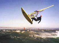 The season starts with strong NW clearing winds in late March or April. These occur off and on through June. During the summer, thermal winds continue well into September but gradually get weaker. In the Spring clearing wind conditions, sail sizes commonly range from 4.0 to 5.0. In the Summer thermal winds conditions, sails in the 5.0 to 6.0 are more common. In the Spring, a full suit is recommended. In the Summer, lighter weight suits will do and short sleeve suits are sometimes used on warmer days *although full suits are recommended to survive a major breakdown far out in the Bay.