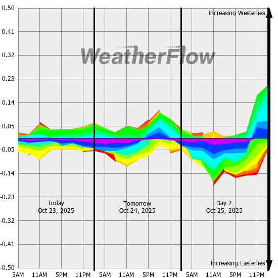 Computer forecast models generally can not resolve the topography of the Gorge and hence model predicted winds are often inaccurate. However, models can predict localized air pressure changes with a great deal of accuracy and it's these pressure differences (gradients) that drive the winds through the Gorge. The above "windbow" is a tool that our Meteorologists have developed to provide a powerful quick look of model predicted gradients.