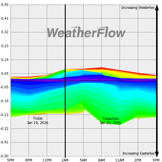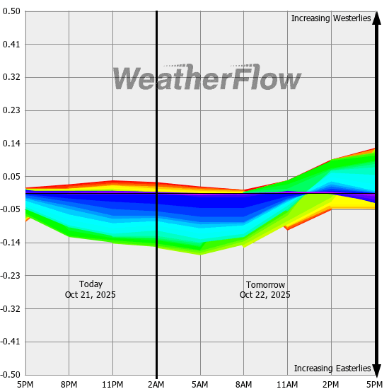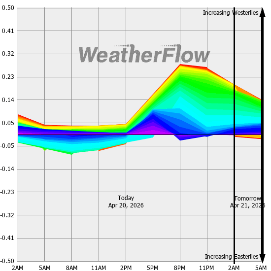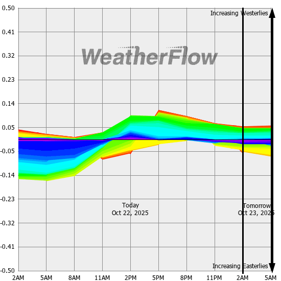 Computer forecast models generally can not resolve the topography of the Gorge and hence model predicted winds are often inaccurate. However, models can predict localized air pressure changes with a great deal of accuracy and it's these pressure differences (gradients) that drive the winds through the Gorge. The above "windbow" is a tool that our Meteorologists have developed to provide a powerful quick look of model predicted gradients.