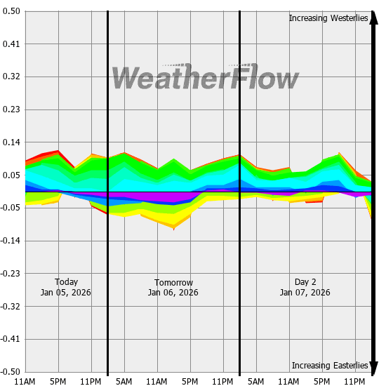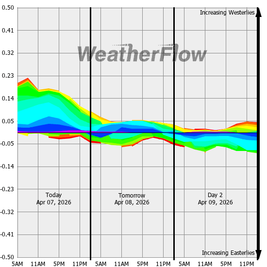 Computer forecast models generally can not resolve the topography of the Gorge and hence model predicted winds are often inaccurate. However, models can predict localized air pressure changes with a great deal of accuracy and it's these pressure differences (gradients) that drive the winds through the Gorge. The above "windbow" is a tool that our Meteorologists have developed to provide a powerful quick look of model predicted gradients.