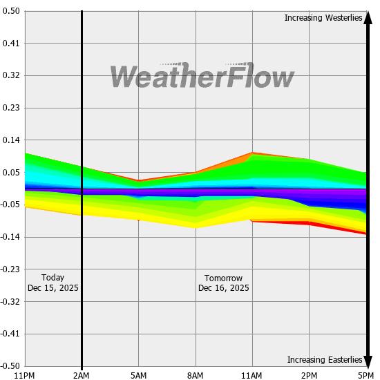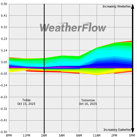 Computer forecast models generally can not resolve the topography of the Gorge and hence model predicted winds are often inaccurate. However, models can predict localized air pressure changes with a great deal of accuracy and it's these pressure differences (gradients) that drive the winds through the Gorge. The above "windbow" is a tool that our Meteorologists have developed to provide a powerful quick look of model predicted gradients.