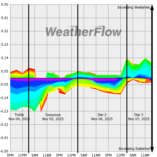 Computer forecast models generally can not resolve the topography of the Gorge and hence model predicted winds are often inaccurate. However, models can predict localized air pressure changes with a great deal of accuracy and it's these pressure differences (gradients) that drive the winds through the Gorge. The above "windbow" is a tool that our Meteorologists have developed to provide a powerful quick look of model predicted gradients.