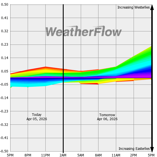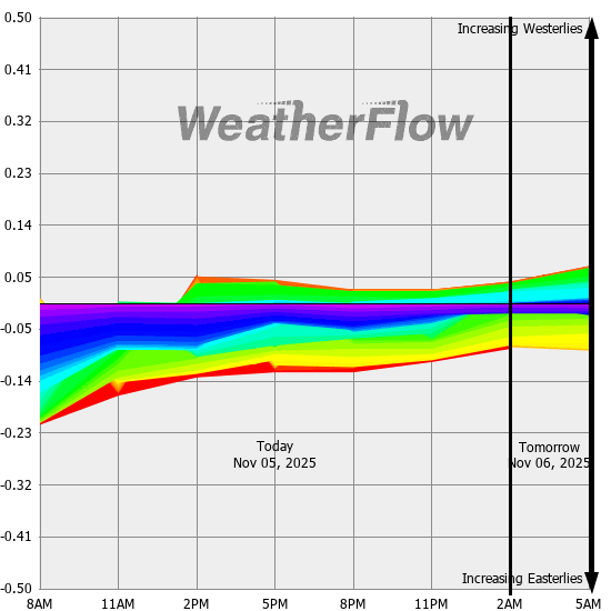 Computer forecast models generally can not resolve the topography of the Gorge and hence model predicted winds are often inaccurate. However, models can predict localized air pressure changes with a great deal of accuracy and it's these pressure differences (gradients) that drive the winds through the Gorge. The above "windbow" is a tool that our Meteorologists have developed to provide a powerful quick look of model predicted gradients.