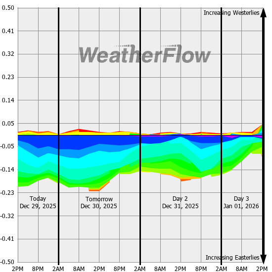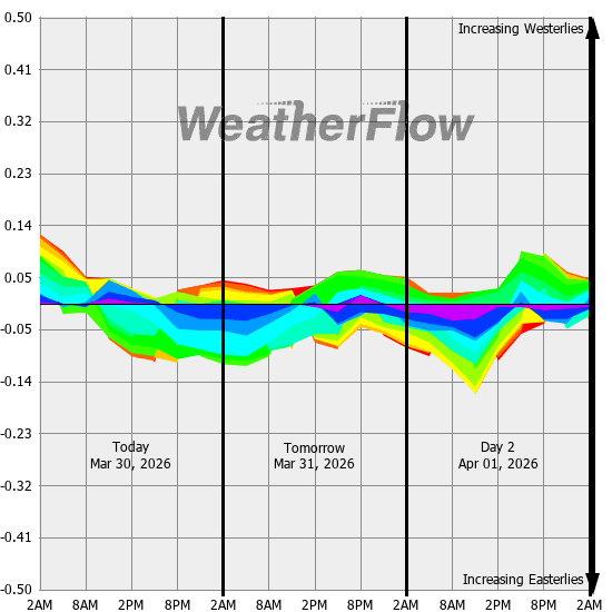 Computer forecast models generally can not resolve the topography of the Gorge and hence model predicted winds are often inaccurate. However, models can predict localized air pressure changes with a great deal of accuracy and it's these pressure differences (gradients) that drive the winds through the Gorge. The above "windbow" is a tool that our Meteorologists have developed to provide a powerful quick look of model predicted gradients.