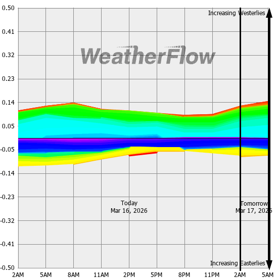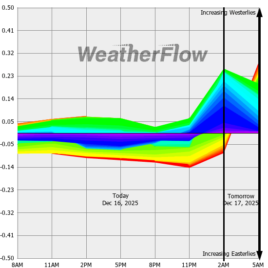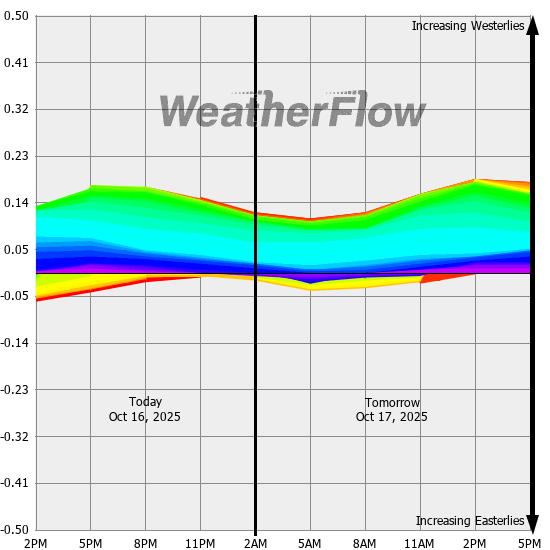 Computer forecast models generally can not resolve the topography of the Gorge and hence model predicted winds are often inaccurate. However, models can predict localized air pressure changes with a great deal of accuracy and it's these pressure differences (gradients) that drive the winds through the Gorge. The above "windbow" is a tool that our Meteorologists have developed to provide a powerful quick look of model predicted gradients.