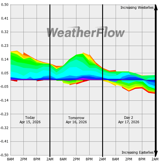 Computer forecast models generally can not resolve the topography of the Gorge and hence model predicted winds are often inaccurate. However, models can predict localized air pressure changes with a great deal of accuracy and it's these pressure differences (gradients) that drive the winds through the Gorge. The above "windbow" is a tool that our Meteorologists have developed to provide a powerful quick look of model predicted gradients.